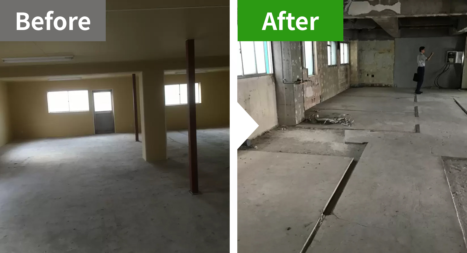 95坪の広さのスケルトン工事を行いました。エレベーターなしのテナントでしたが問題なく対応いたしました。